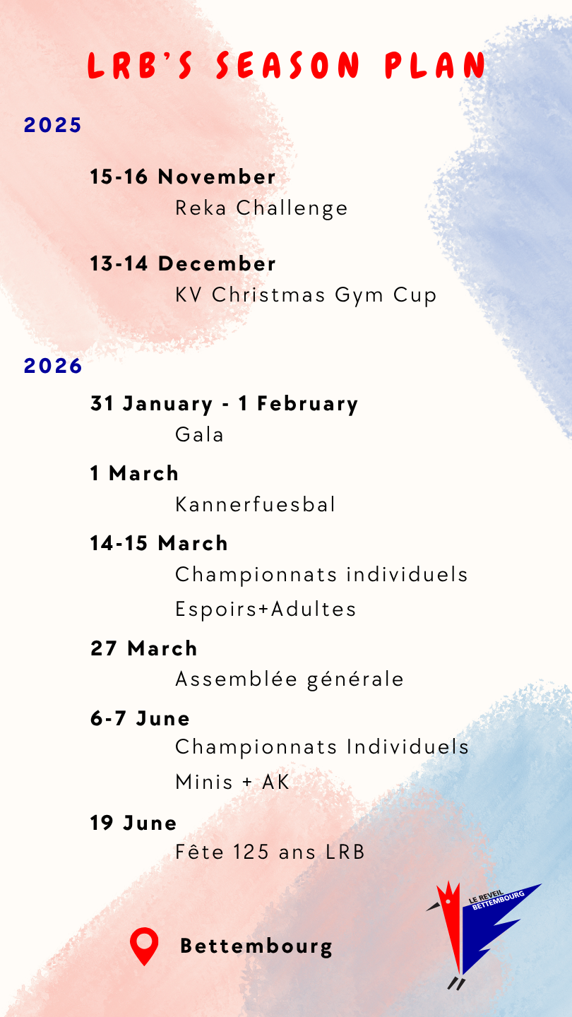 Datumer vun de Manifestatioune vum LRB zu Beetebuerg 2025 15-16 Novembre Reka Challenge 13-14 Decembre KV Christmas Cup 2026 31 Janvier – 1