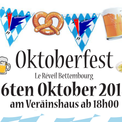 Iessen zwëschen 19h00-21h00 Umeldung beim Alain Bosseler bis den 1ten Oktober iwwert: Facebook PM, SMS op 621 141 886 oder oktoberfest@lereveil.lu